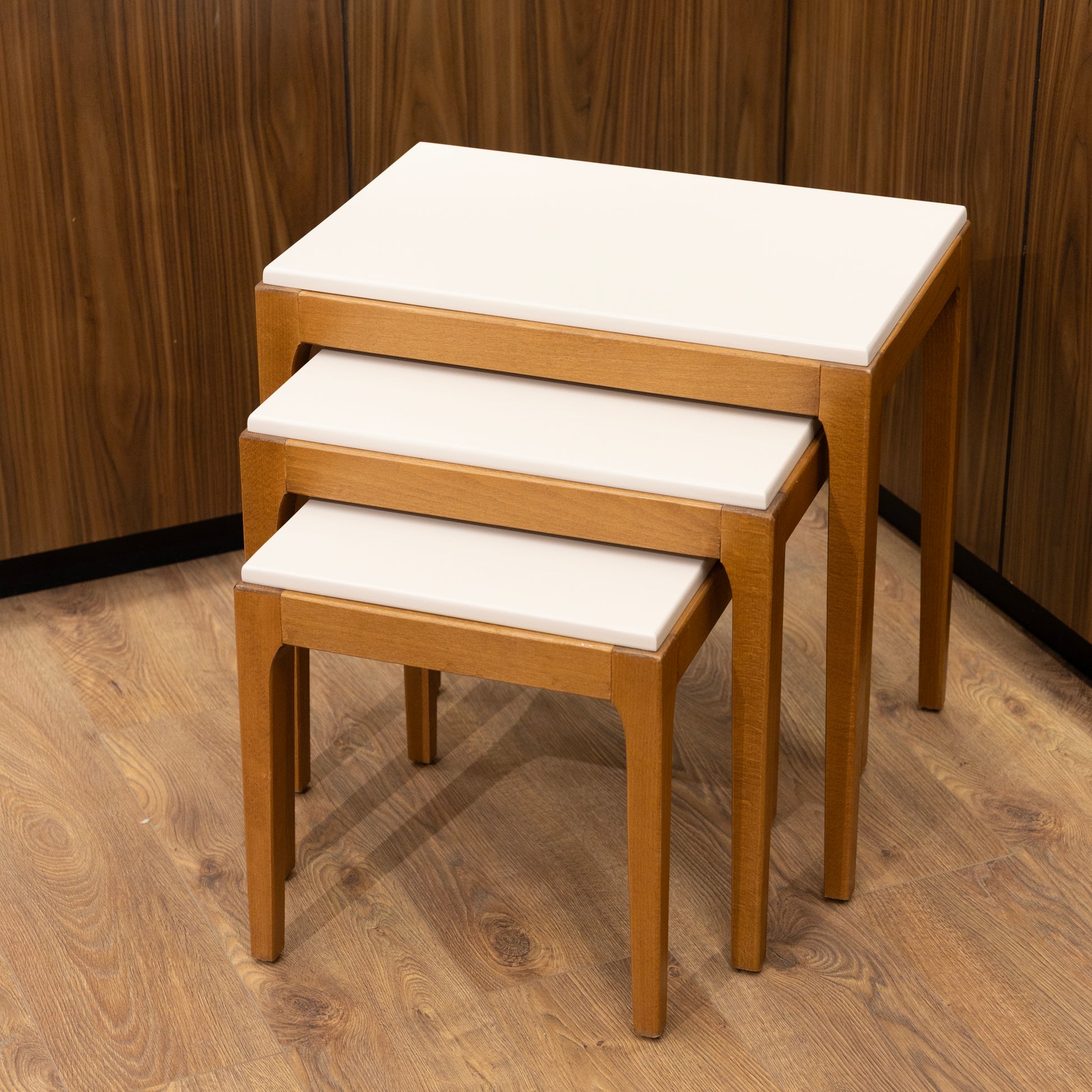 A modern 3-piece nesting table set with clean lines and customizable finishes. Featuring beech wood legs and your choice of smoky or other top colors, this set is designed for versatility and contemporary elegance.